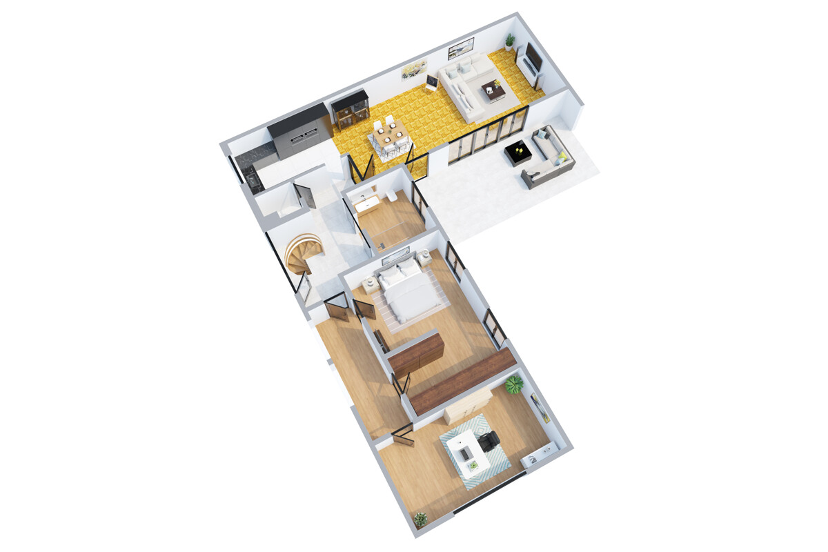 Über die zentrale Diele erschließt sich das Haus logisch und angenehm. Der private Schlafbereich ist ruhig separiert, während sich auf der gegenüberliegenden Seite der offen gestaltete Wohn-, Ess- und Küchenbereich öffnet. Dieser bildet das Herzstück des Hauses: weitläufig, lichtdurchflutet und mit fließendem Übergang zur Terrasse mit Markise sowie in den Garten – ideal für Alltag, Familie und Gäste.