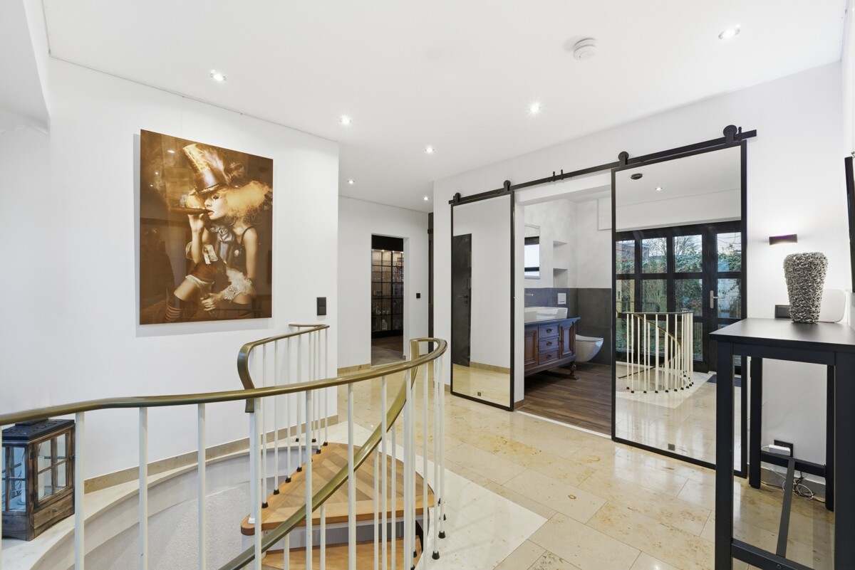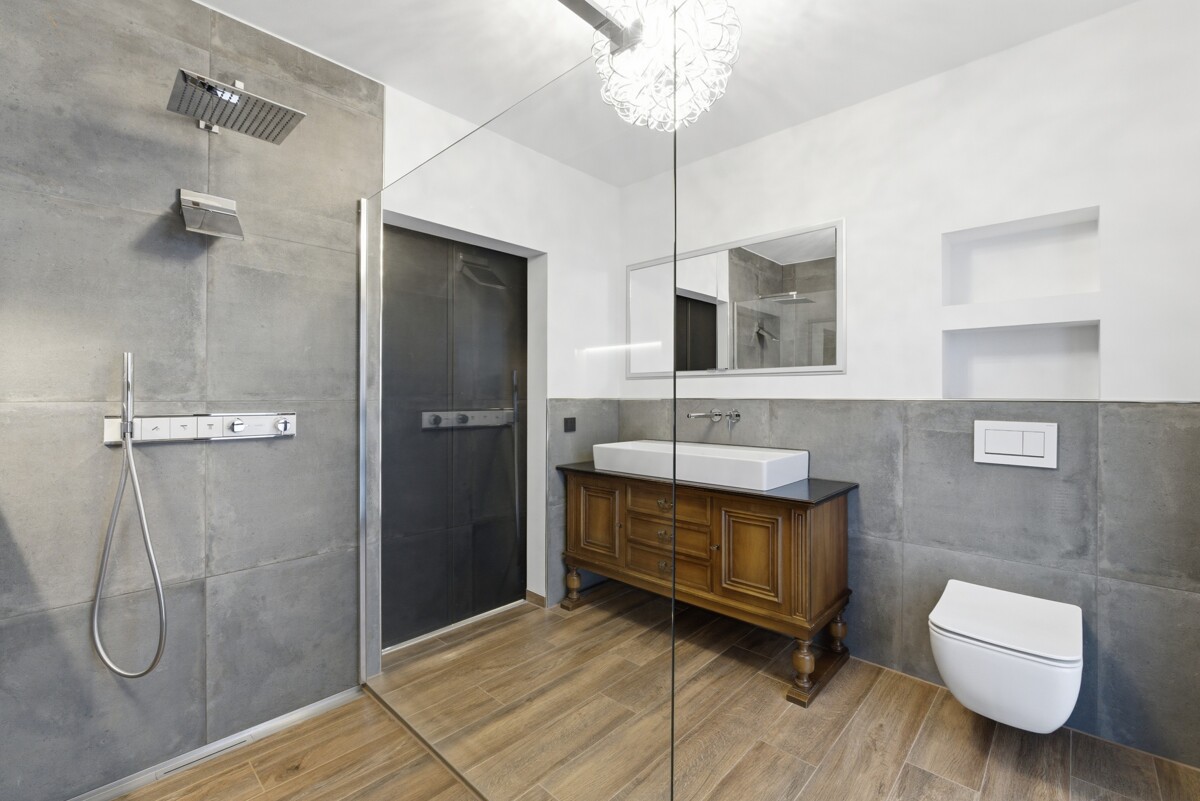 Das Schlafzimmer verfügt über eine offen integrierte Ankleide, die aus einem ehemals eigenständigen Zimmer entstanden ist und bei Bedarf wieder abgetrennt werden kann. Ein weiterer Raum eignet sich flexibel als Büro, Kinder- oder Gästezimmer. Ein modern gestaltetes Bad mit Regendusche sowie ein separates Gäste-WC ergänzen das stimmige Raumangebot.