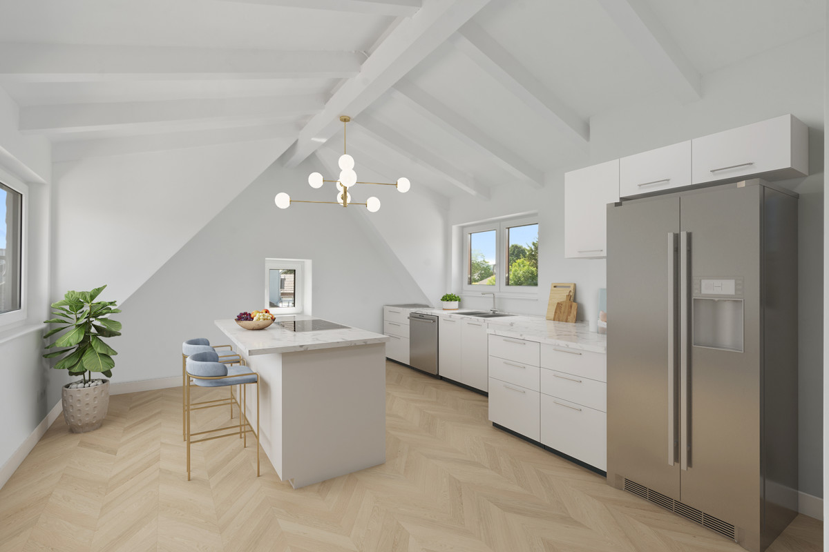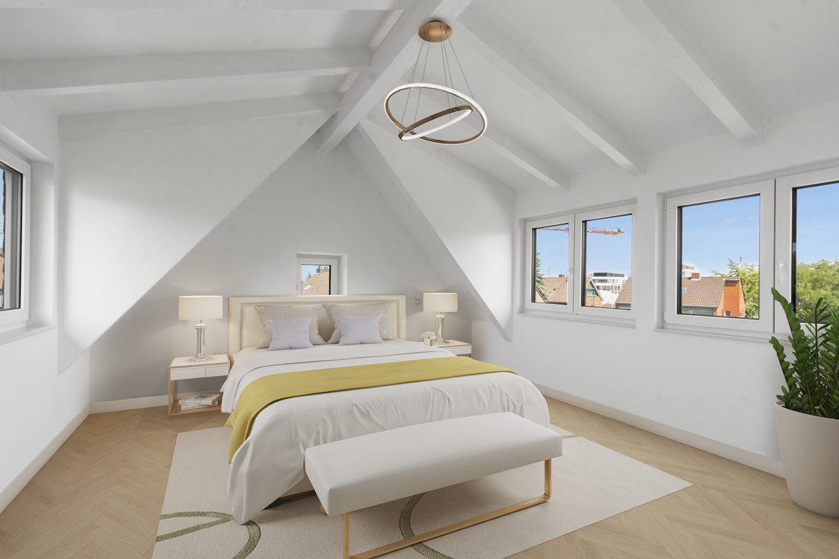 Das Schlafzimmer ist gemütlich unter der Dachschräge eingebettet, der Wohnbereich besticht durch seine luftige Struktur und charmante Details. Die offene Essküche schafft Raum zum Kochen, Leben und Genießen – mit Blick bis unter den Dachfirst.