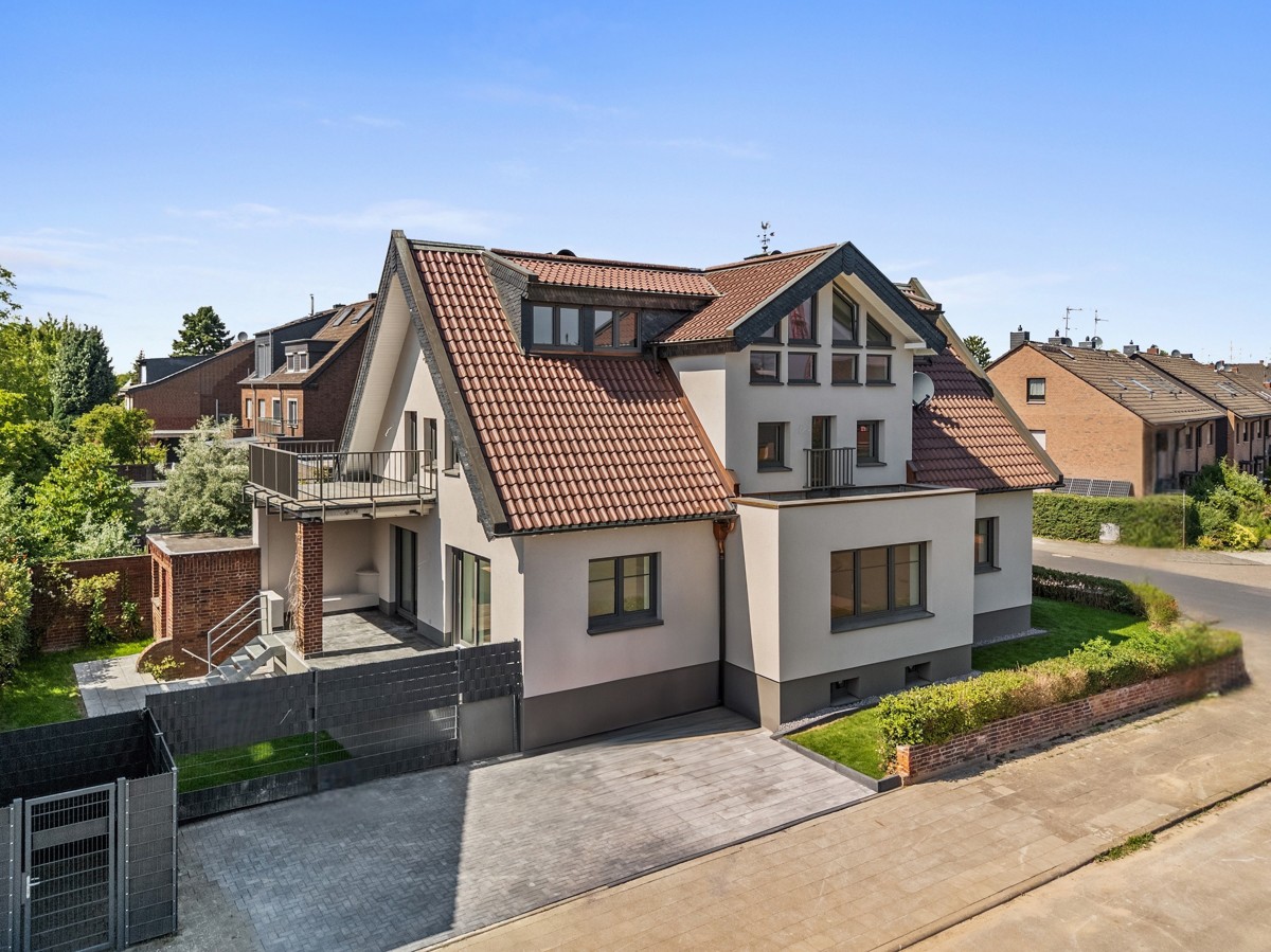 Die Fassade überzeugt mit warmem Cappuccino-Grau, dreifach verglaste Fenster in Quarzgrau außen und Weiß innen sorgen für ein stimmiges Gesamtbild. Besonders schön: die Dacheindeckung mit roten Tonplatten, ergänzt durch Kupfer- und Schieferelemente. Das rund 424 m² große Grundstück ist gepflegt und durchdacht angelegt.