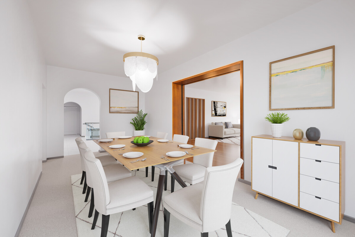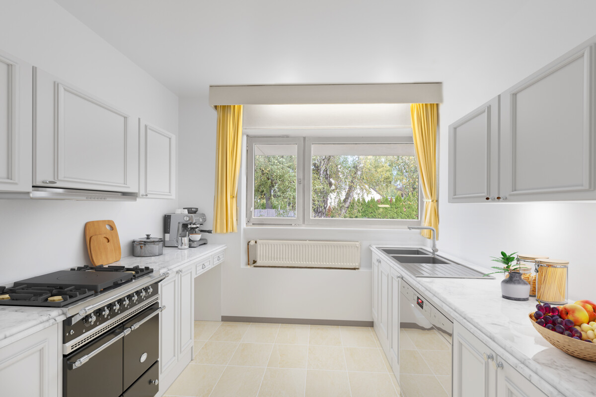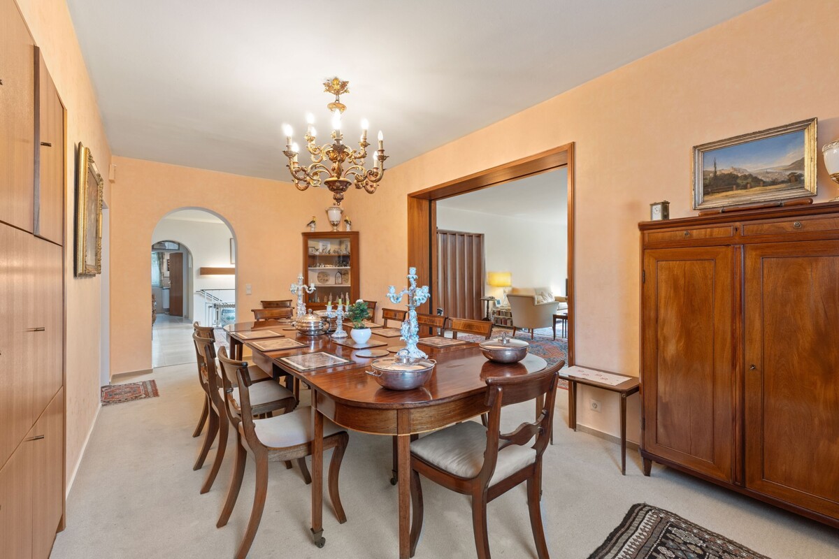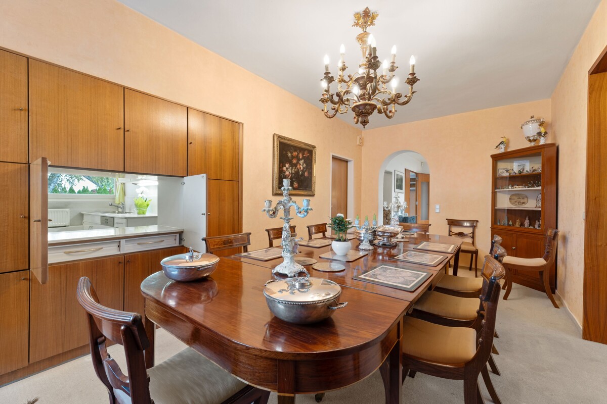 Angrenzend liegt das großzügige Esszimmer. Die Küche mit Vorraum und Durchreiche bietet klare Möglichkeiten für ein modernes, offenes Konzept. Drei Schlafzimmer – eines davon mit Bad en Suite – sowie zwei weitere Zimmer, ein Arbeitszimmer und ein zusätzliches Bad komplettieren die Wohnebene.