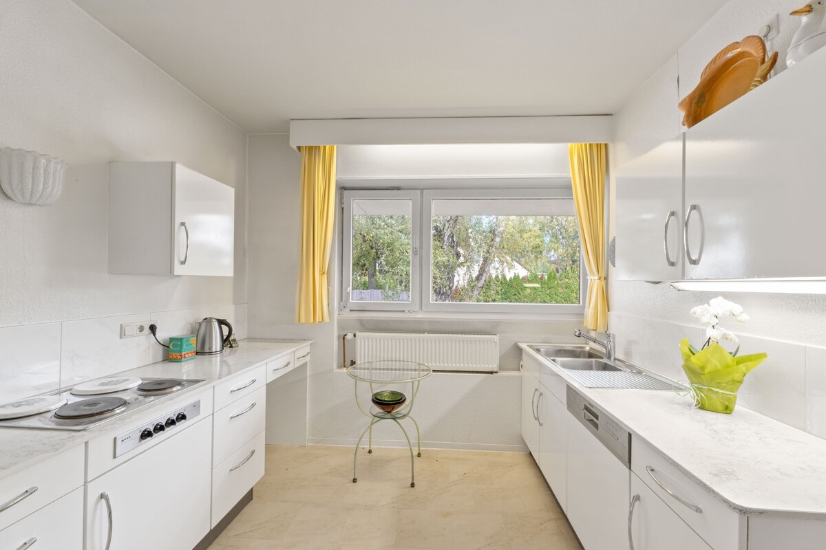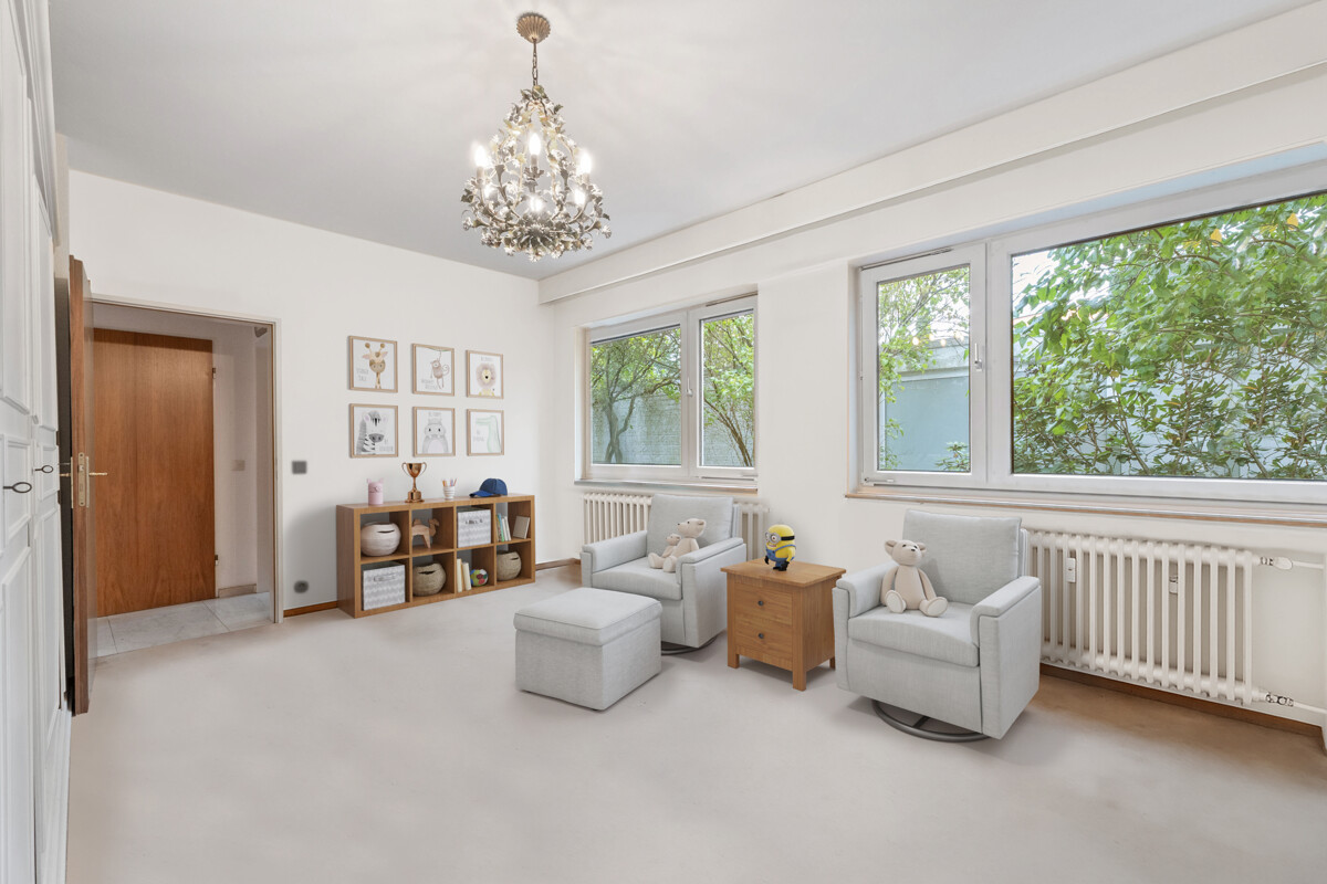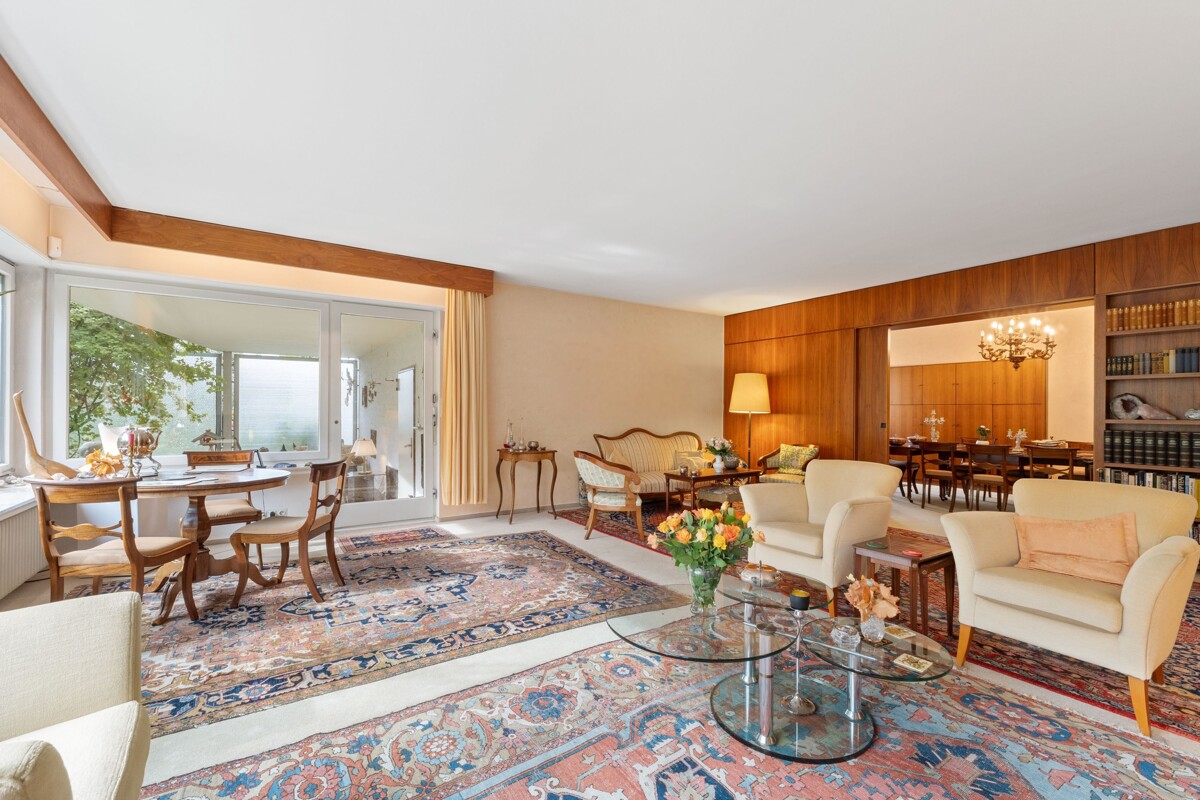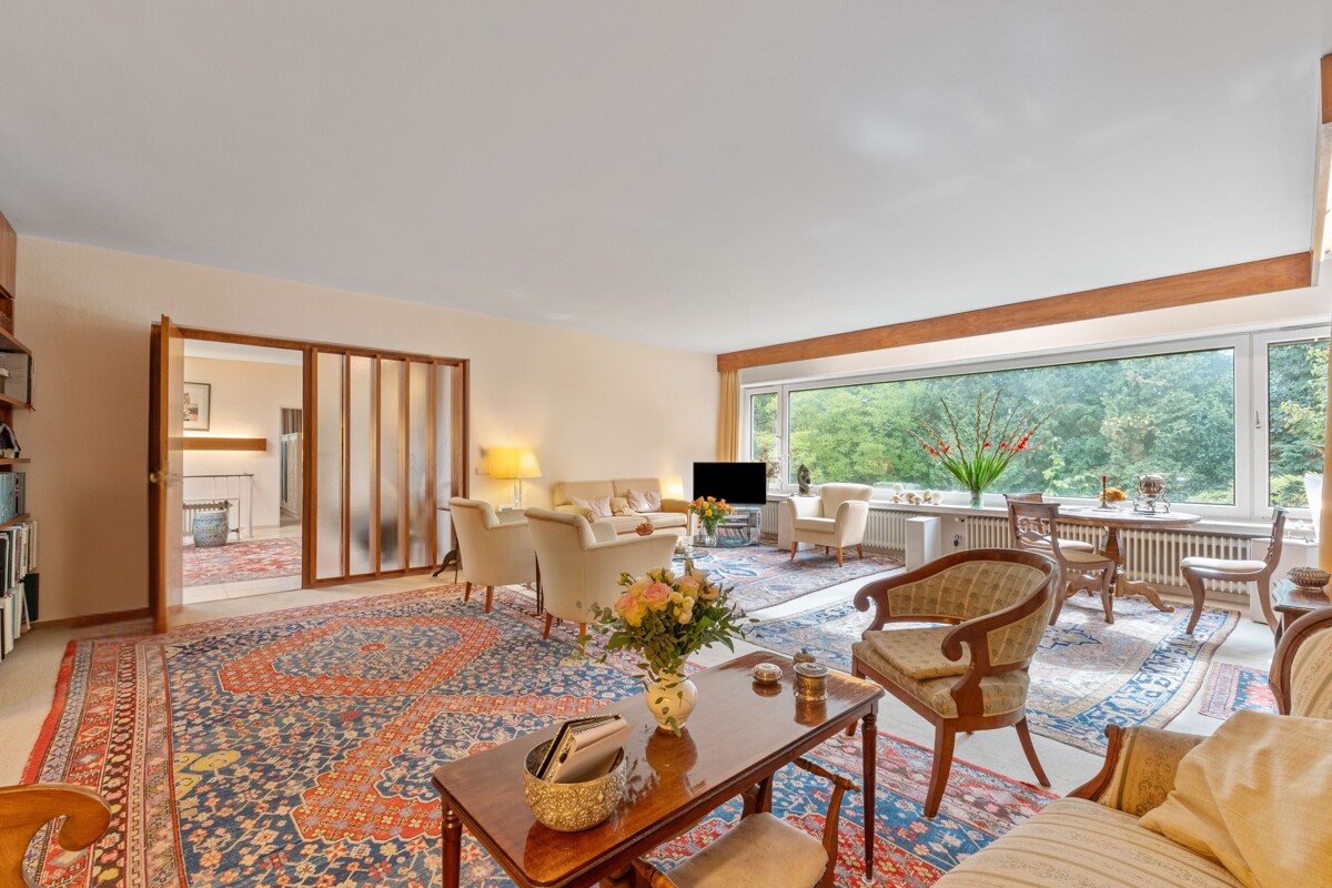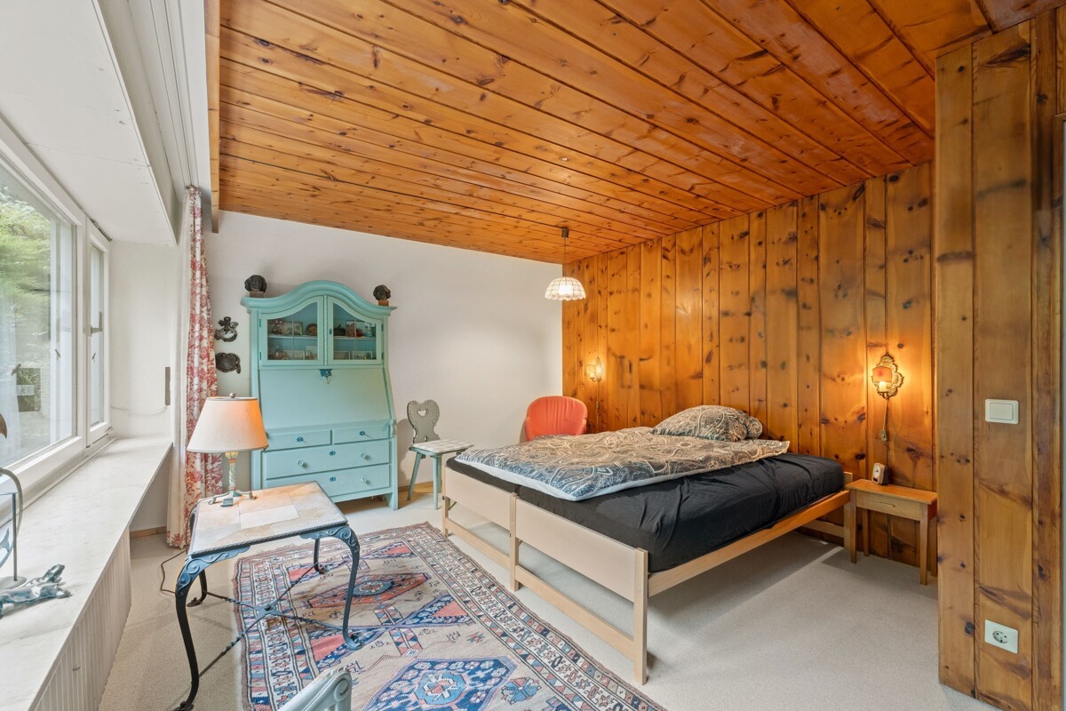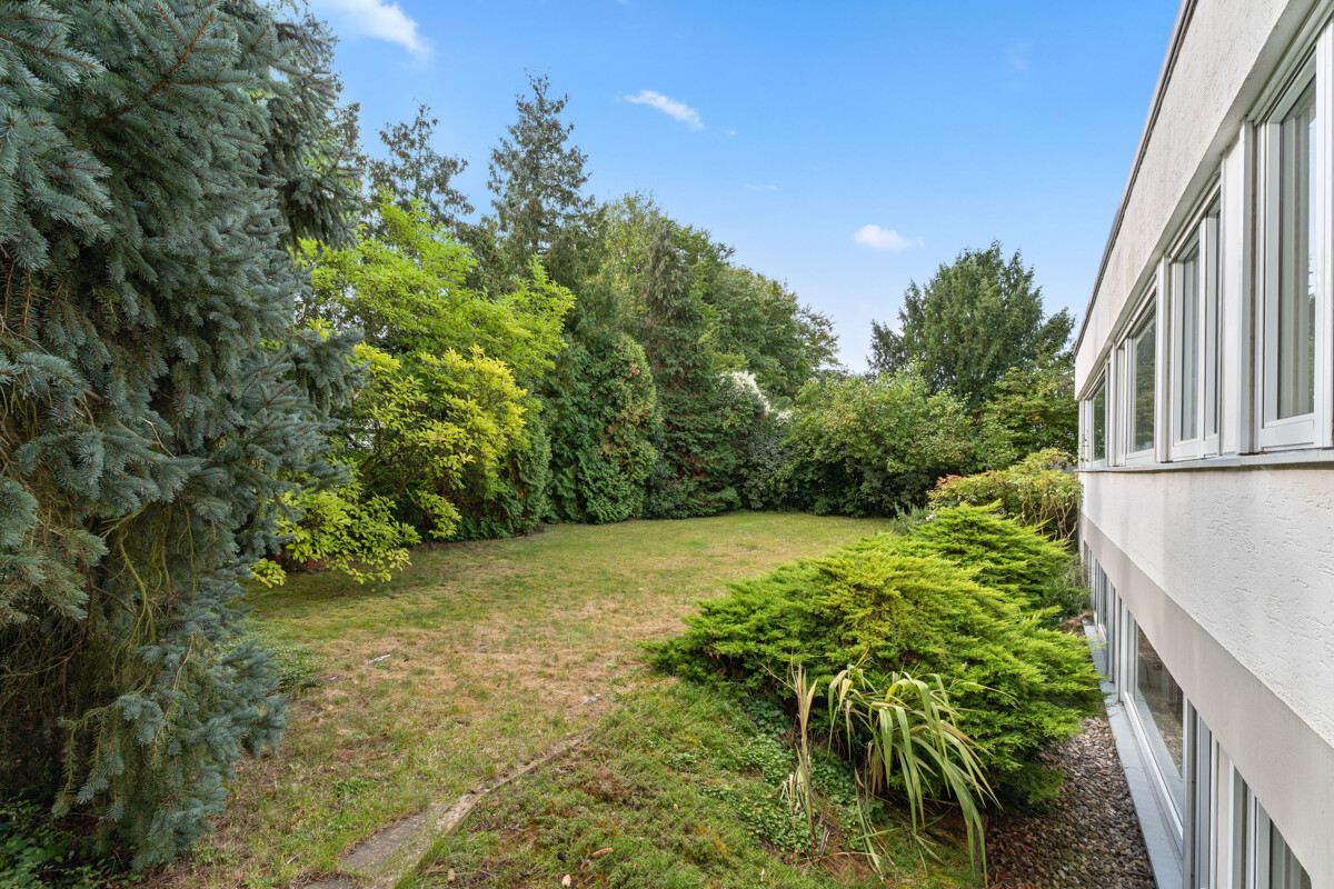 Man spürt, dass hier Menschen gewohnt haben, die viel gesehen haben. Auch wenn die Einrichtung nicht bleibt, hat sie Spuren hinterlassen: ein weltläufiger Charakter, ein Hauch Fernweh in jedem Raum. Das große Wohnzimmer mit breiter Fensterfront öffnet sich zum Garten, der eher einem kleinen Park gleicht: fast 1.000 m², umrahmt von hohen Bäumen, ruhig, privat und mitten in der Gronau – ideal für Sommerfeste, Familienzeit oder entspannte Abende.