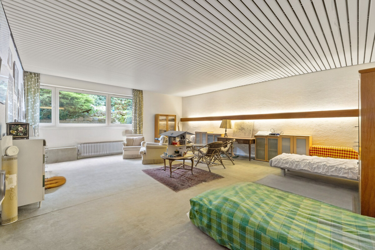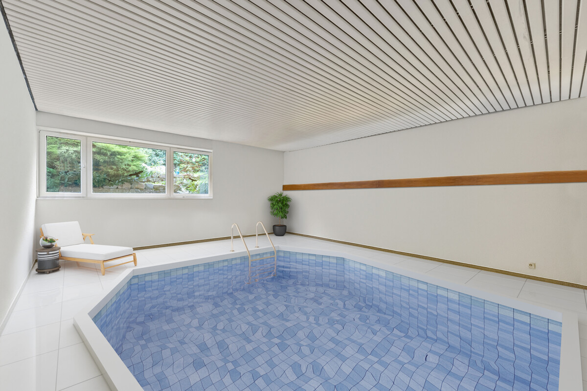 Das Souterrain bietet weit mehr als typischer Kellerraum: große südseitige Fensterflächen, ca. 90 m² beheizte Fläche und drei vollwertige Räume für Schlafen, Arbeiten oder kreative Nutzung. Ein Raum mit Fensterfront steht kurz vor der Anerkennung als Wohnfläche (Bescheid erwartet im 1. Quartal 2026). Dazu kommen ein kleines Bad, eine Waschküche sowie mehrere Kellerräume. Die Fläche des ehemaligen Indoor-Pools eröffnet zusätzliche Optionen – vom Fitness- oder Wohnbereich bis zur Reaktivierung des ursprünglichen Pools.