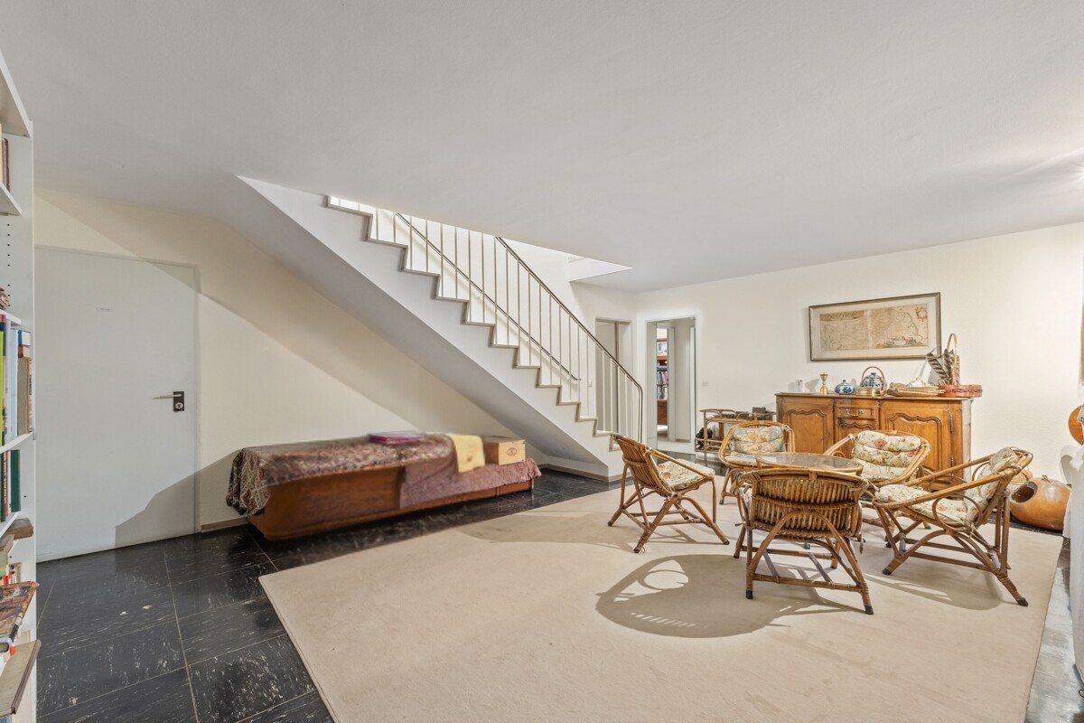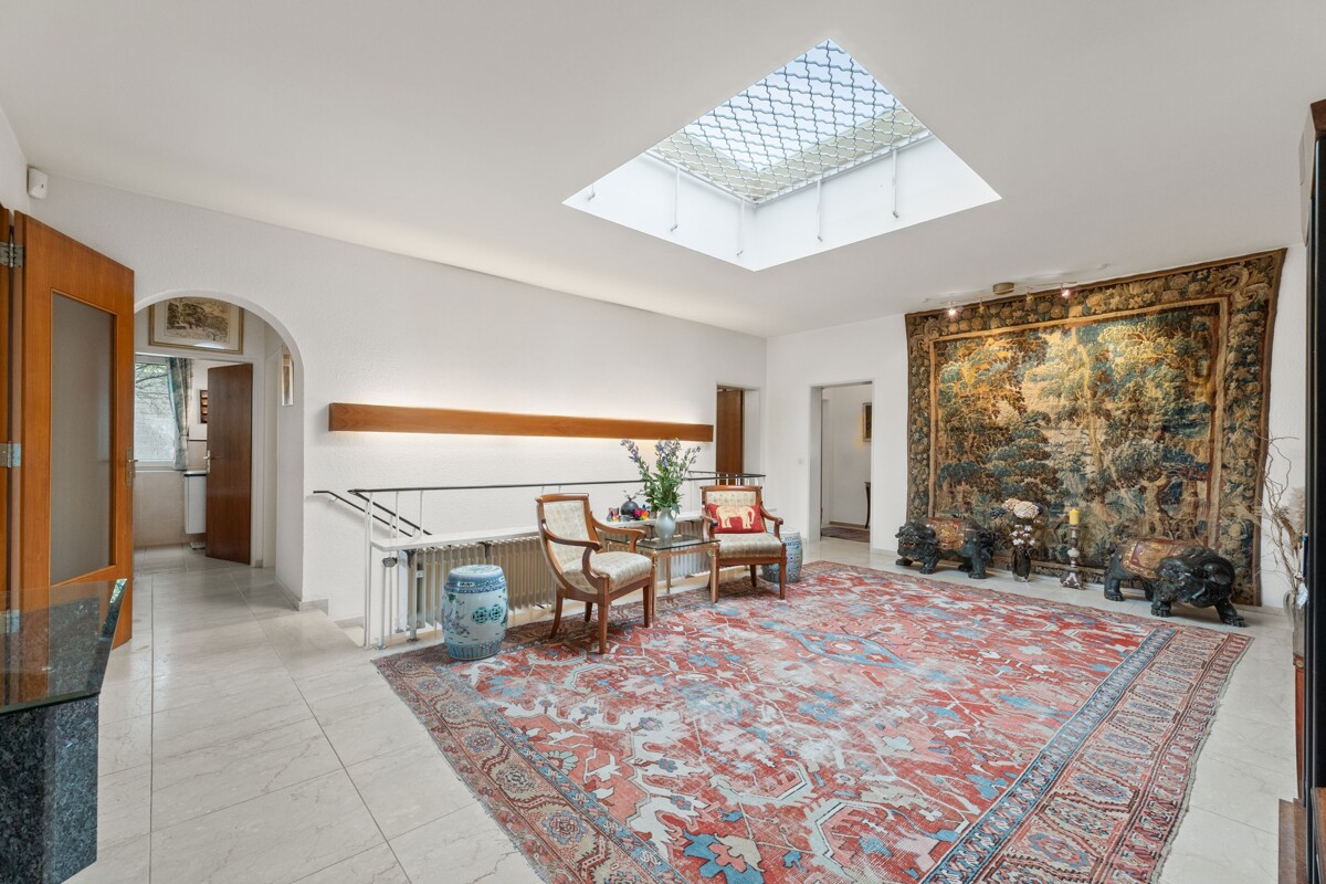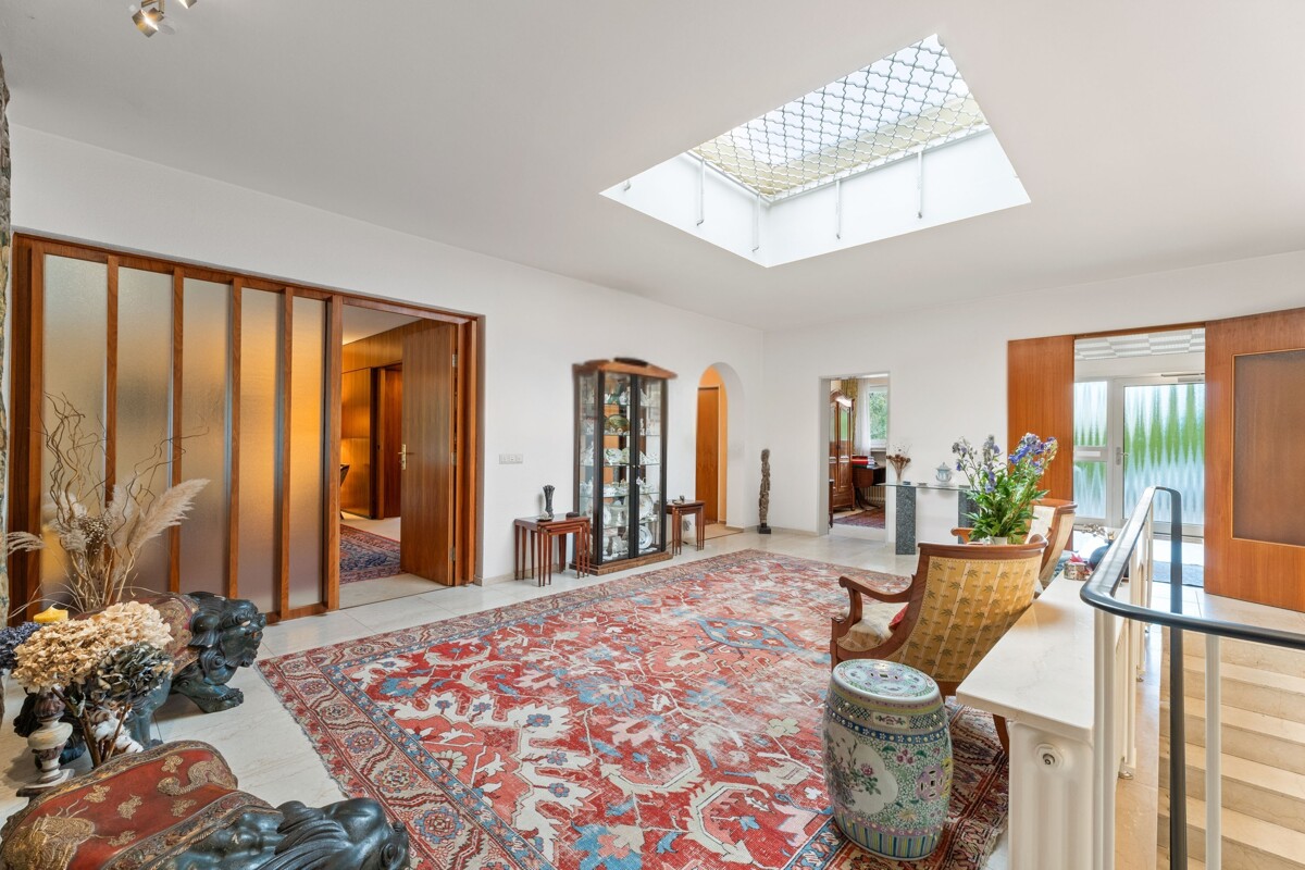 Dieser freistehende 60er-Jahre-Bungalow ist ein Haus, das man betritt und sofort merkt: Hier steckt mehr drin als Beton und Mauern. Die Leichtigkeit der Architektur, die großzügigen Grundrisse und das natürliche Licht schaffen eine Atmosphäre, die man eher fühlt als beschreibt. Schon der Weg über das eingewachsene Grundstück deutet an, was folgt. Hinter dem Eingang öffnet sich eine zentrale Diele mit Natursteinboden und großer Lichtkuppel – der Mittelpunkt des Hauses, warm, offen und sofort einladend.