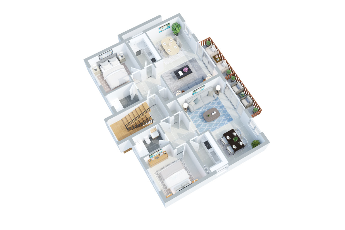 Im Erd- und Obergeschoss erwarten Sie vier nahezu identische 2-Zimmer-Wohnungen mit ca. 62 m². Großzügige Wohn-Essbereiche, bodentiefe Fensterfronten und Balkone laden zum Verweilen ein – morgens beim Kaffee, abends mit Grillduft. Die durchdachten Grundrisse bieten Stauraum, gut geschnittene Schlafzimmer und solide geflieste Bäder. Die Küchen sind bereit für jedes Kochlevel – alltagstauglich und gastfreundlich.