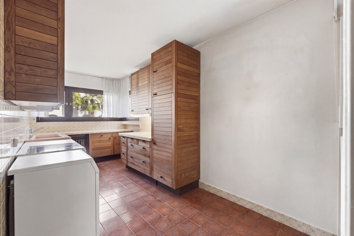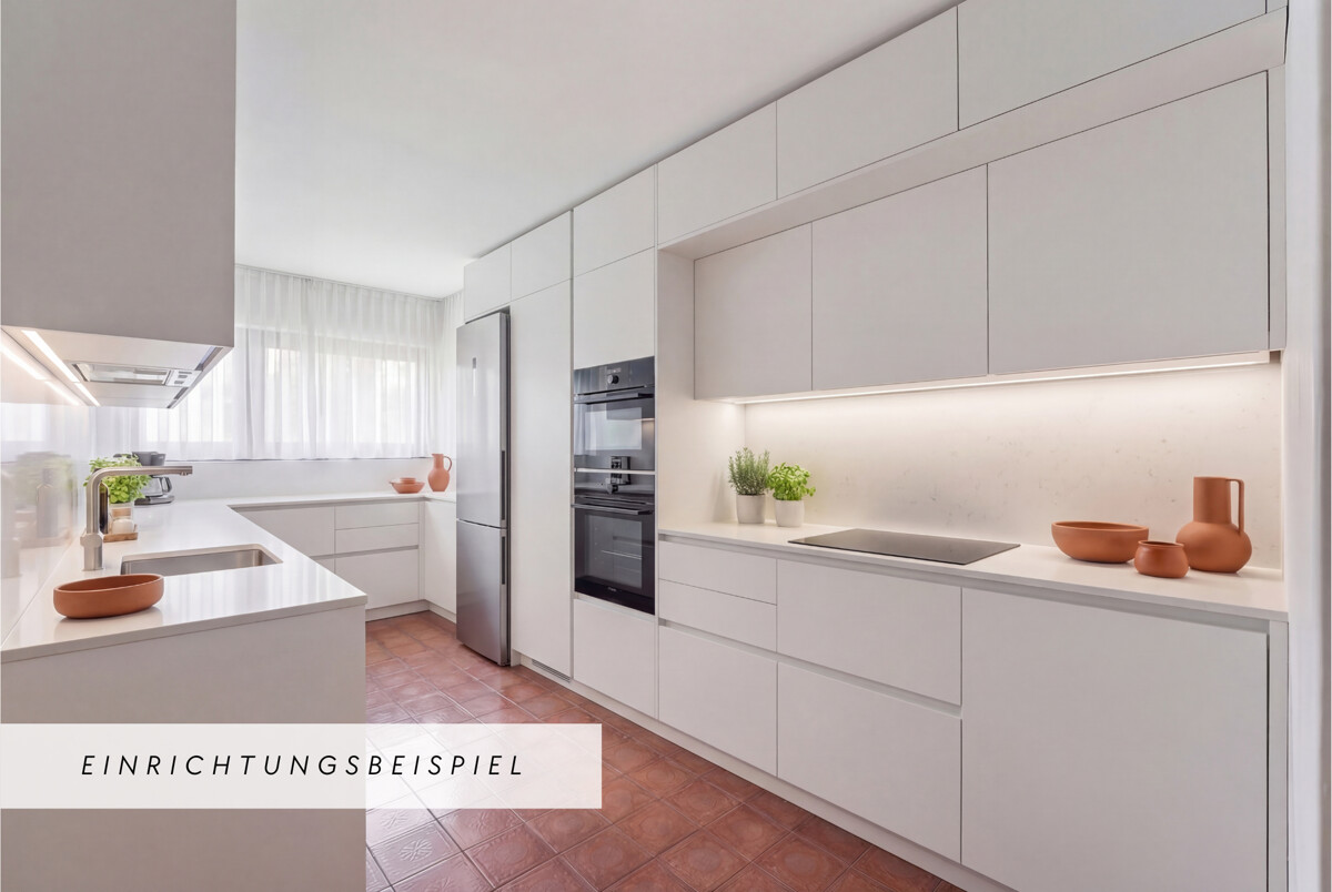 Im hinteren Bereich befinden sich die separate Küche mit Zugang zur Loggia sowie der großzügige Wohn- und Essbereich, der ebenfalls direkten Zugang ins Freie bietet. Hier entsteht ein schöner, heller Mittelpunkt der Wohnung mit Blick ins Grün.