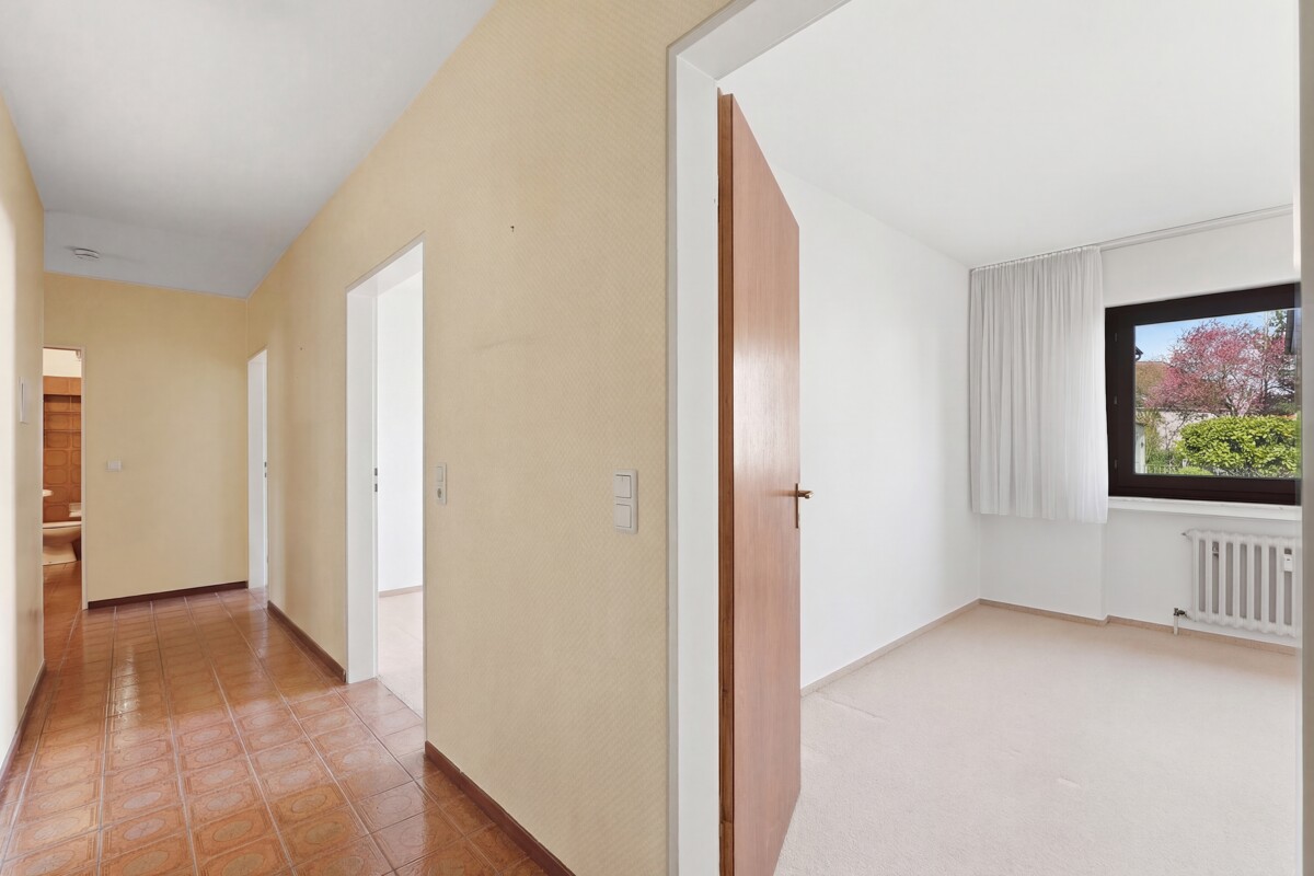 Der Hauseingang ist sowohl über wenige Treppenstufen als auch stufenfrei über die Garagenzufahrt erreichbar. Von hier aus führen Treppenhaus und Aufzug in das offizielle Erdgeschoss. Durch die Hanglage wirkt die Wohnung jedoch angenehm erhöht und eher wie ein 1. Obergeschoss.